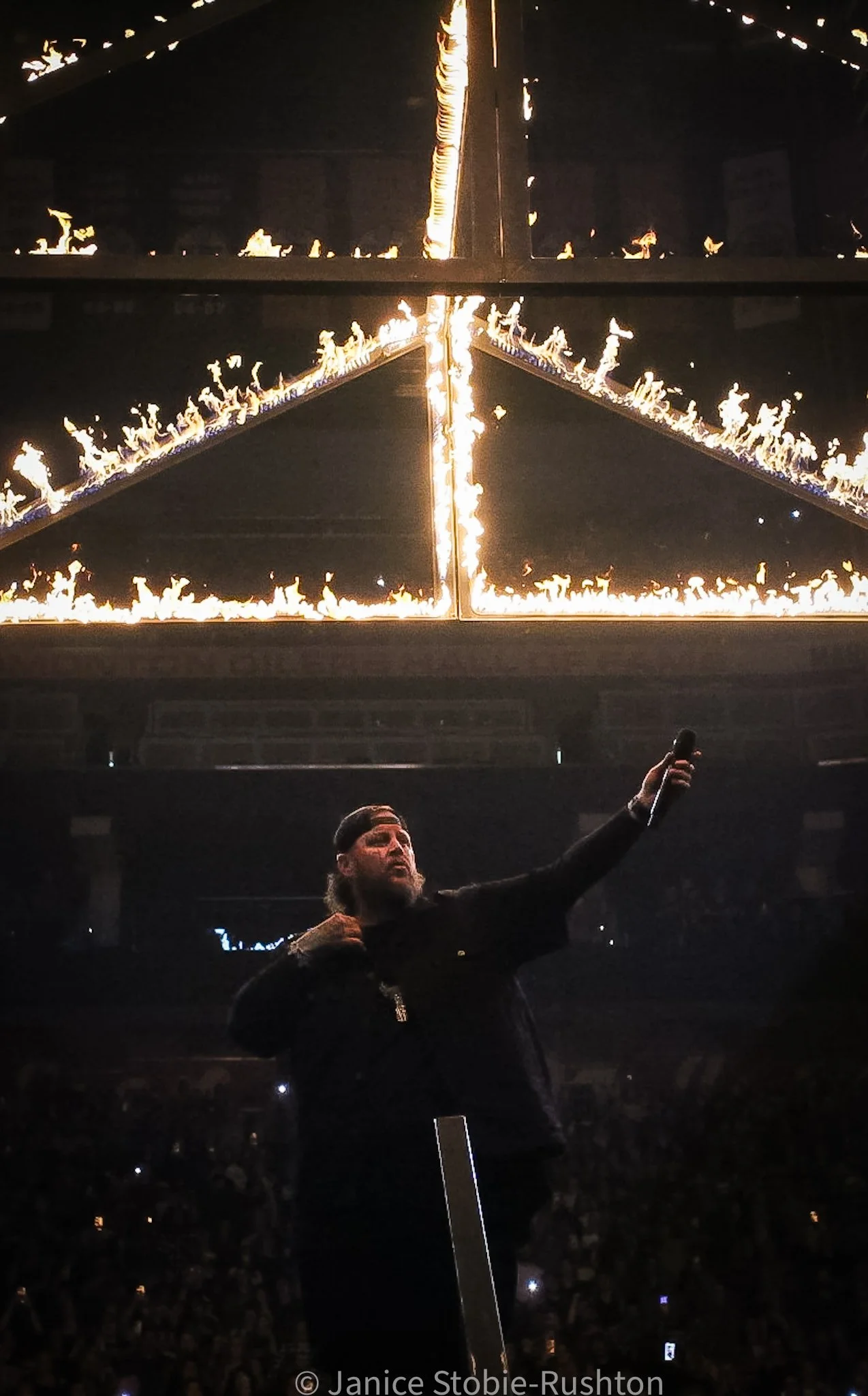 The spiritual revival started with a slow walk through the crowd to a platform stage. As he sang his hit I Am Not Okay, a fire frame lowered from above to surround him. The crowd was enthralled by his presence, giving his sermon as rock n roll survivor of addiction and reborn in house of flames. On the main stage, fittingly set in a sea of red and towering flames, the song Halfway to Hell kept the crowd on their feet.